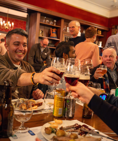 Etter omvisning og ølsmaking vil du få servert kokkens utvalgte middagsbuffet med deilige varme og kalde retter. Her settes gode smaker sammen, basert på sesongens råvarer, slik at du kan nyte den lune atmosfæren og de gode stundene i Gildehallen.